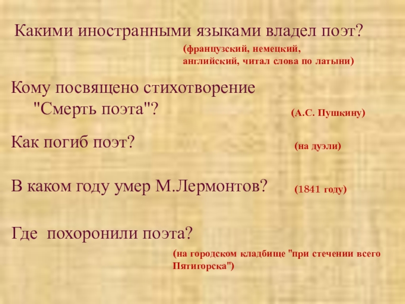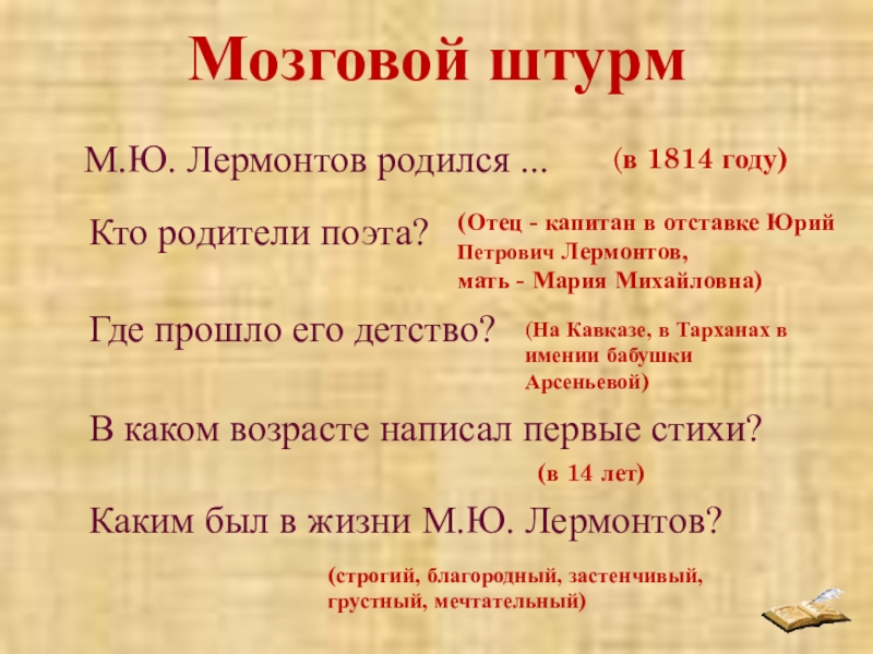 (Отец - капитан в отставке Юрий Петрович Лермонтов, мать - Мария Михайловна)