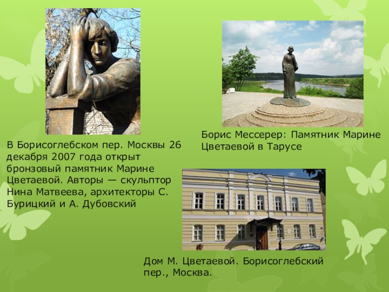 В Борисоглебском пер. Москвы 26 декабря 2007 года открыт бронзовый памятник Марине Цветаевой. Авторы — скульптор Нина Матвеева, архитекторы С. Бурицкий и А. Дубовский