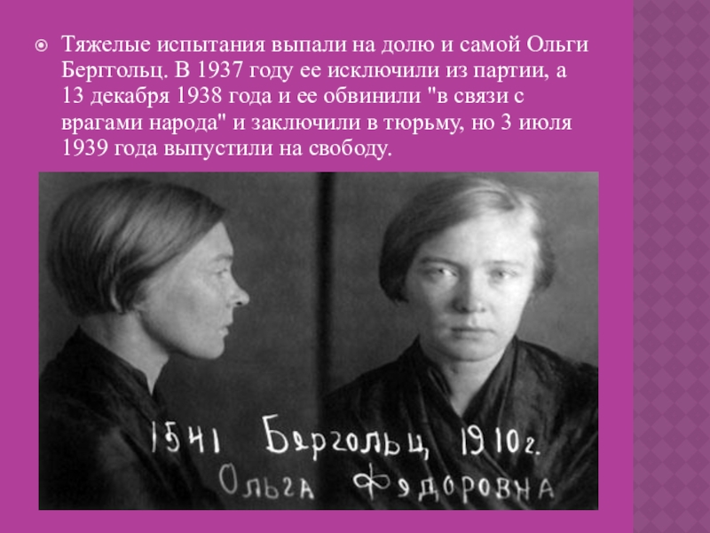 Слайд 5Тяжелые испытания выпали на долю и самой Ольги Берггольц. В 1937