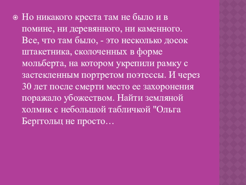 ни каменного. Все, что там было, - это несколько досок штакетника, сколоченных в форме мольберта, на котором укрепили рамку с застекленным портретом поэтессы. И через 30 лет после смерти место ее захоронения поражало убожеством. Найти земляной холмик с небольшой табличкой "Ольга Берггольц не просто…