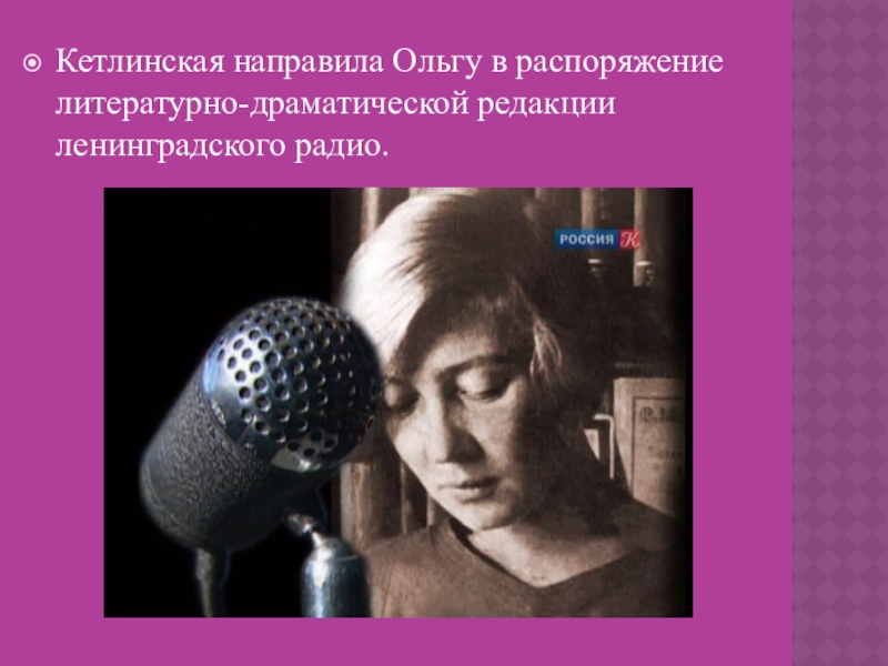Слайд 7Кетлинская направила Ольгу в распоряжение литературно-драматической редакции ленинградского радио.