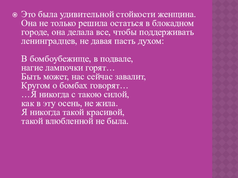 Слайд 10Это была удивительной стойкости женщина. Она не только решила остаться в