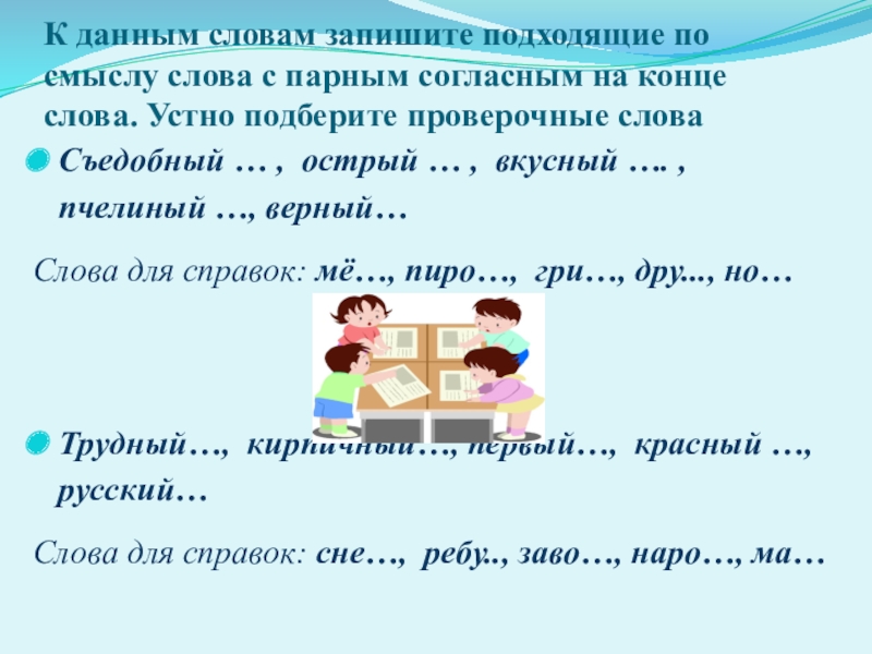 Слова для справок: мё…, пиро…, гри…, дру..., но…