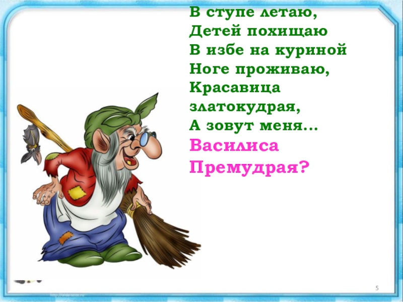 В ступе летаю,Детей похищаю В избе на куриной Ноге проживаю, Красавица златокудрая, А зовут меня... Василиса Премудрая?