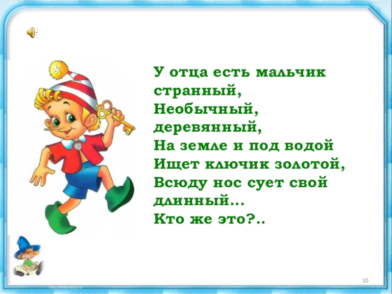 Слайд 10У отца есть мальчик странный, Необычный, деревянный, На земле и под водой Ищет ключик