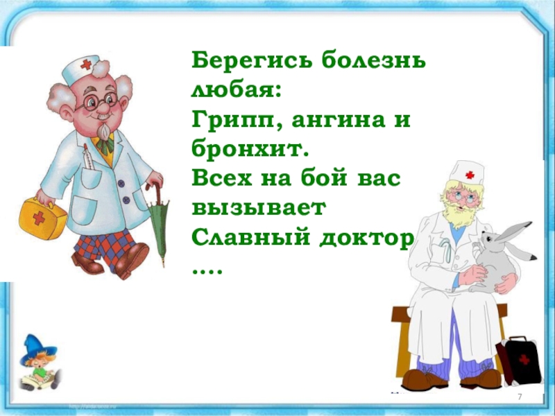 Слайд 7Берегись болезнь любая: Грипп, ангина и бронхит. Всех на бой вас вызывает Славный доктор