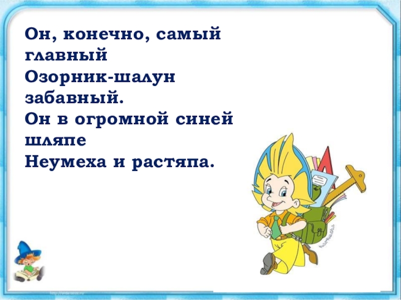 Слайд 4Он, конечно, самый главный Озорник-шалун забавный. Он в огромной синей шляпе Неумеха и растяпа.