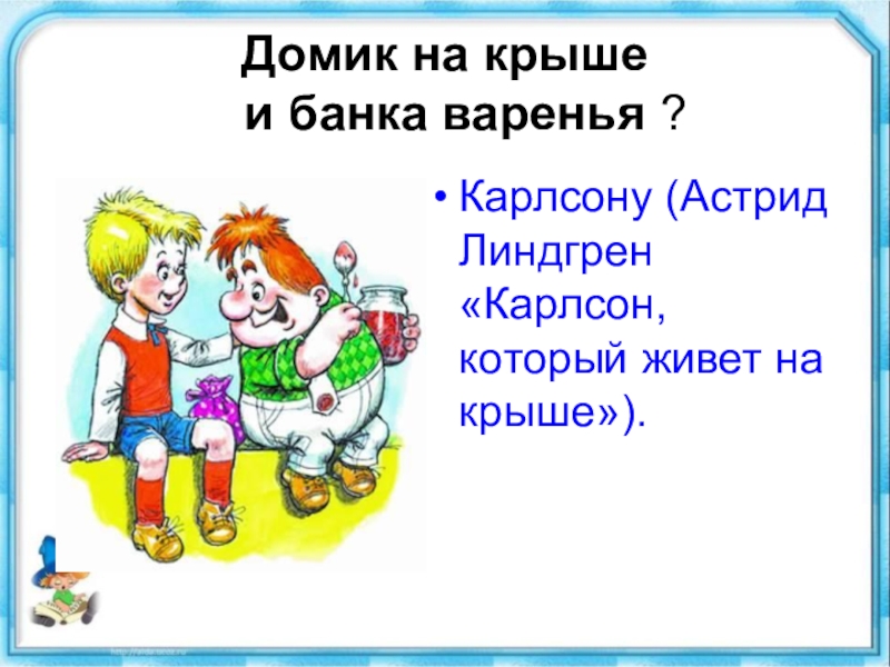 Домик на крыше    и банка варенья ?Карлсону (Астрид Линдгрен «Карлсон, который живет на крыше»).