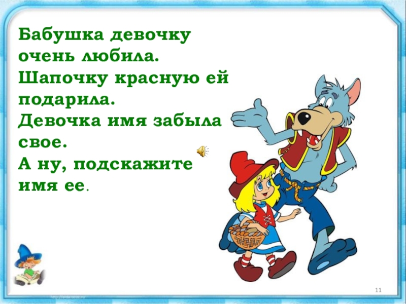 Слайд 11Бабушка девочку очень любила. Шапочку красную ей подарила. Девочка имя забыла свое. А ну,