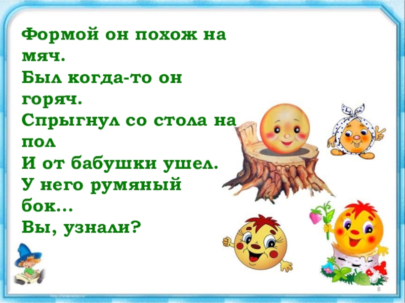 Слайд 8Формой он похож на мяч. Был когда-то он горяч. Спрыгнул со стола на