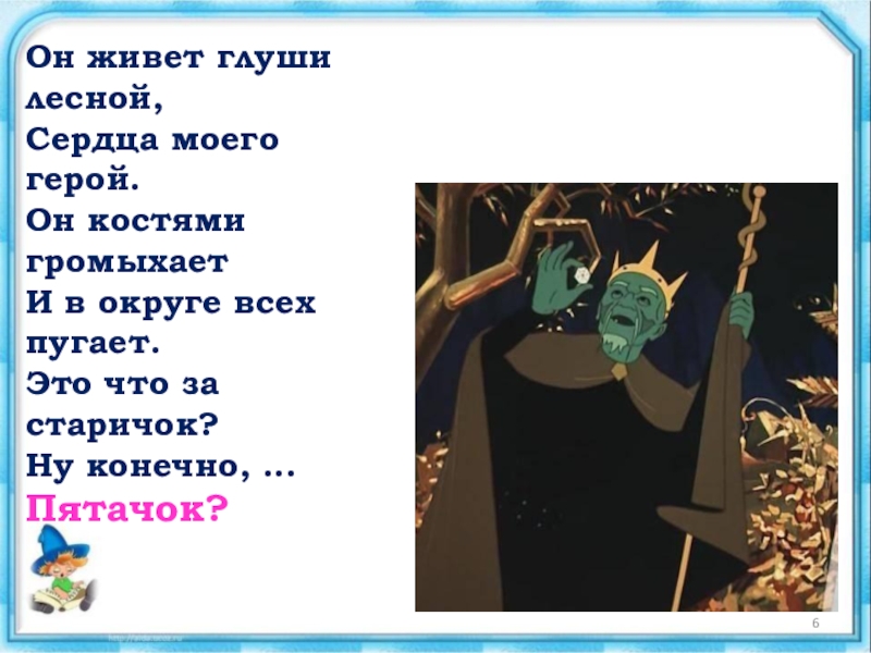 Слайд 6Он живет глуши лесной, Сердца моего герой. Он костями громыхает И