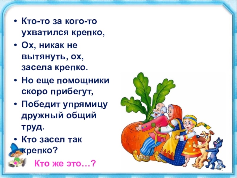 Кто-то за кого-то ухватился крепко, Ох, никак не вытянуть, ох, засела крепко. Но еще помощники скоро прибегут,