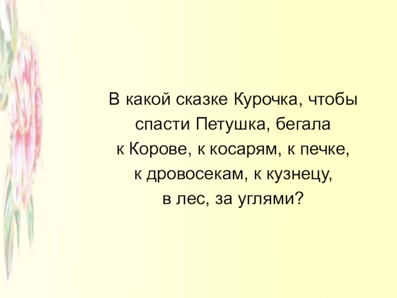 В какой сказке Курочка, чтобы спасти Петушка, бегала к Корове, к косарям, к печке, к дровосекам, к