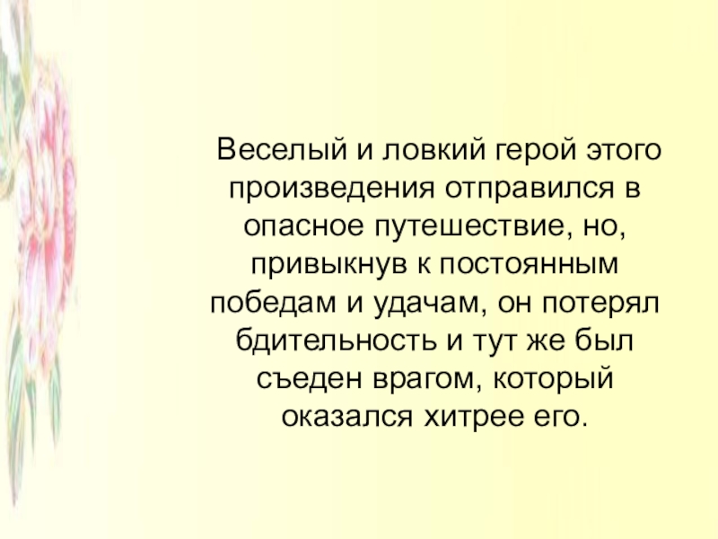 Слайд 22 Веселый и ловкий герой этого произведения отправился в опасное путешествие, но,