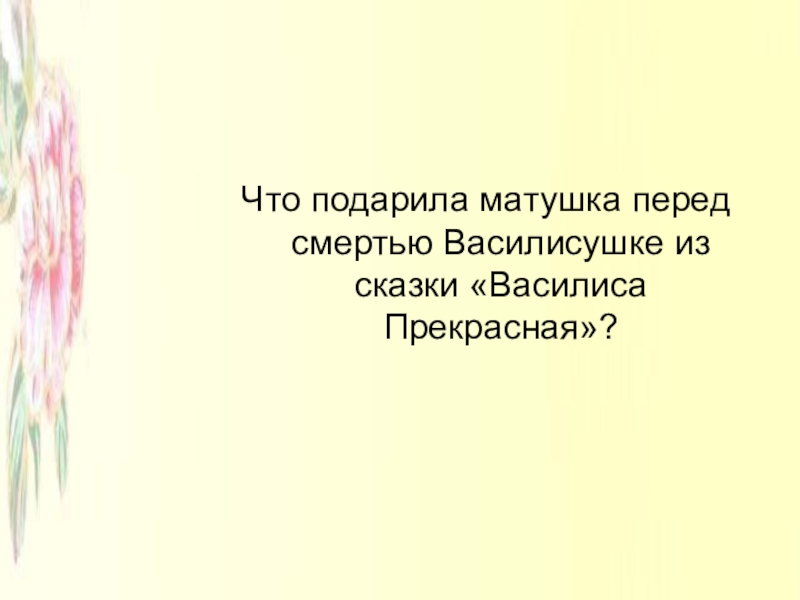 Слайд 16Что подарила матушка перед смертью Василисушке из сказки «Василиса Прекрасная»?