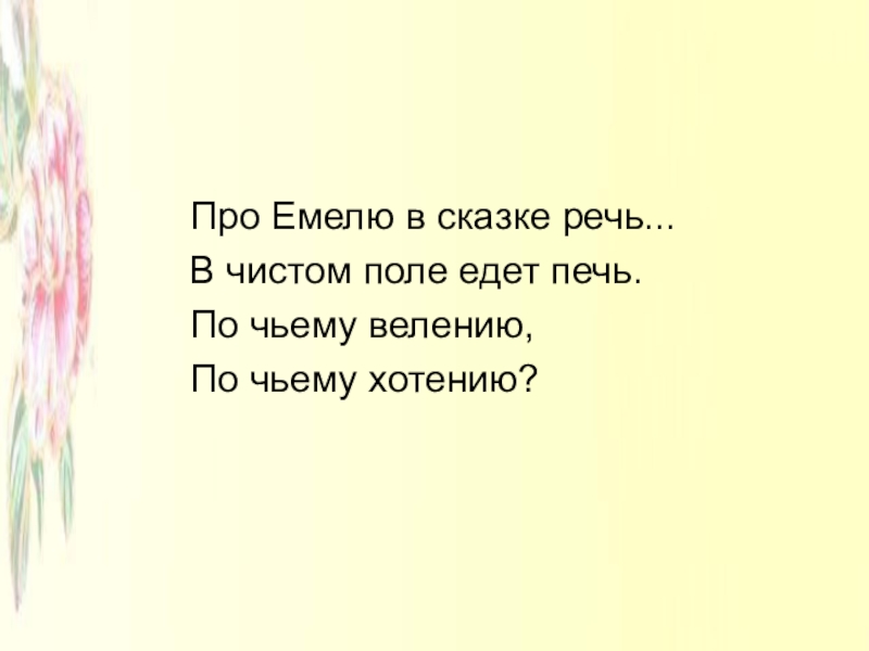 Про Емелю в сказке речь...В чистом поле едет печь.По чьему велению,По чьему хотению?
