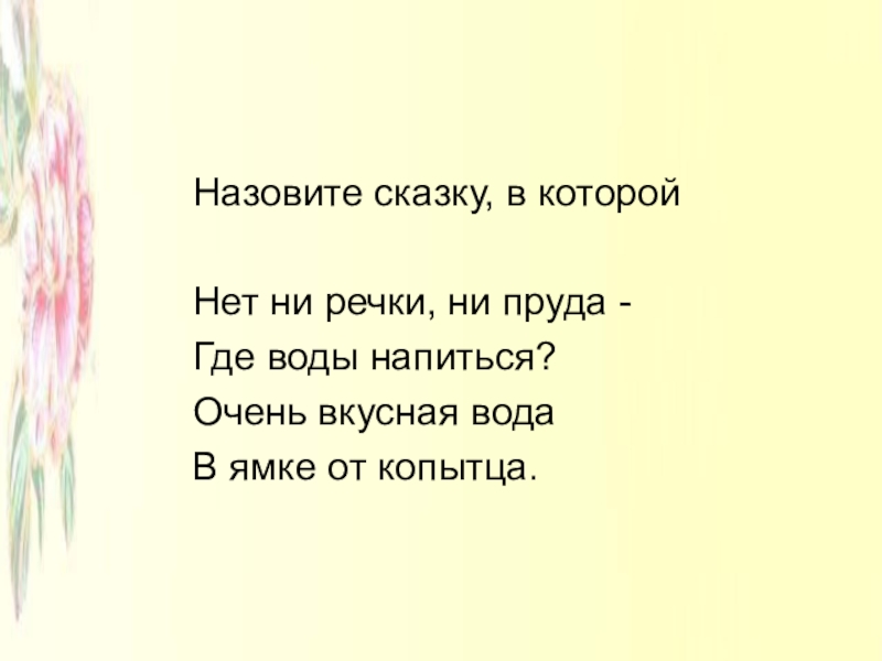 Назовите сказку, в которойНет ни речки, ни пруда -Где воды напиться?Очень вкусная водаВ ямке от копытца.