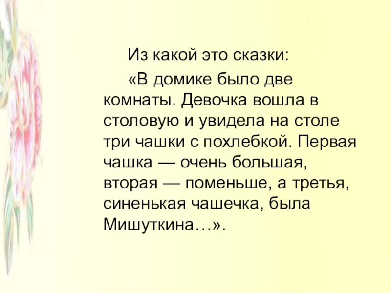 Из какой это сказки:		«В домике было две комнаты. Девочка вошла в столовую и увидела на столе три