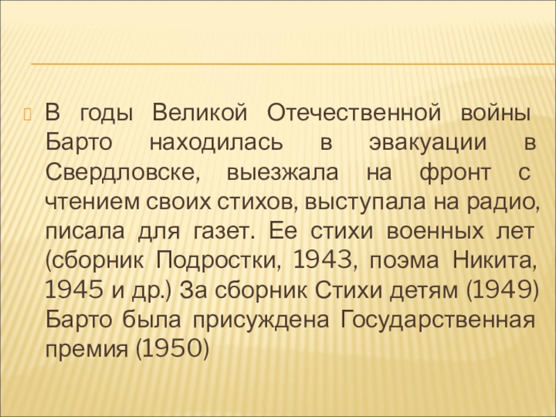 выезжала на фронт с чтением своих стихов, выступала на радио, писала для газет. Ее стихи военных лет (сборник Подростки, 1943, поэма Никита, 1945 и др.) За сборник Стихи детям (1949) Барто была присуждена Государственная премия (1950)