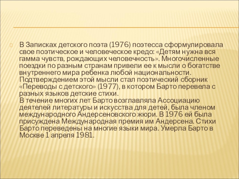Слайд 9В Записках детского поэта (1976) поэтесса сформулировала свое поэтическое и человеческое