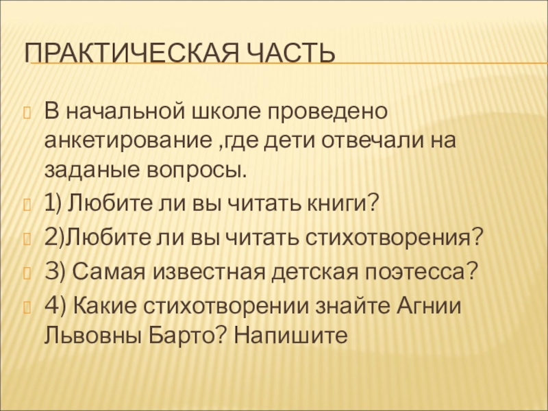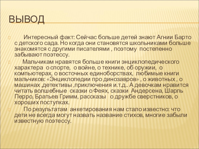 По результатам анкетирования нам стало известно: что дети не всегда могут назвать название стихов, многие забыли известную поэтессу.