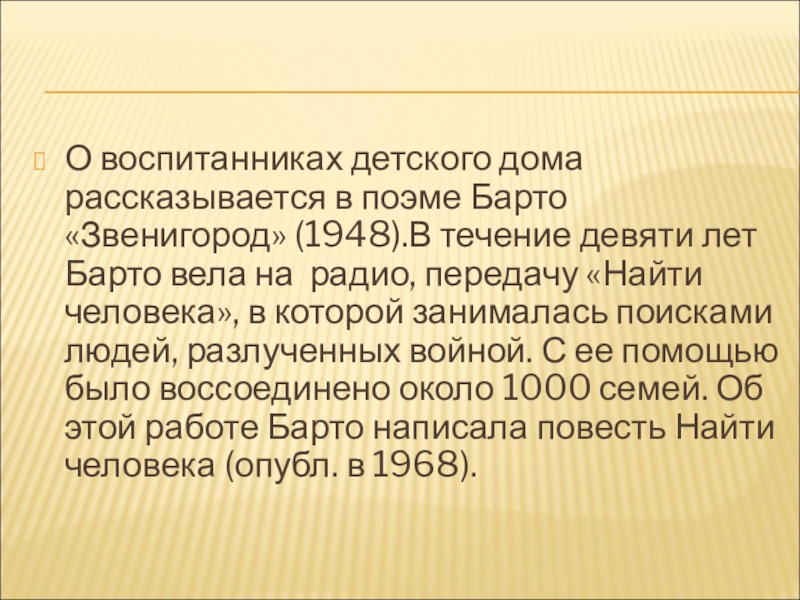 девяти лет Барто вела на радио, передачу «Найти человека», в которой занималась поисками людей, разлученных войной. С ее помощью было воссоединено около 1000 семей. Об этой работе Барто написала повесть Найти человека (опубл. в 1968).