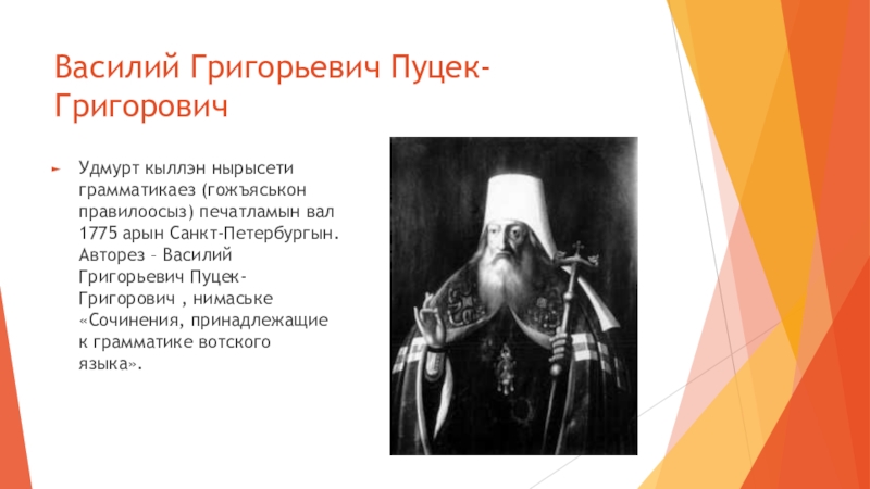 Василий Григорьевич Пуцек-Григорович Удмурт кыллэн нырысети грамматикаез (гожъяськон правилоосыз) печатламын вал 1775 арын Санкт-Петербургын. Авторез – Василий