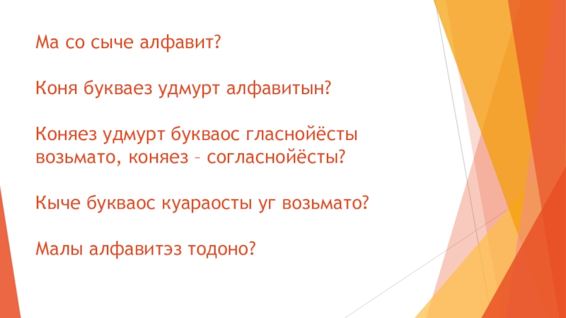 Слайд 3Ма со сыче алфавит? Коня букваез удмурт алфавитын? Коняез удмурт букваос гласнойёсты возьмато,