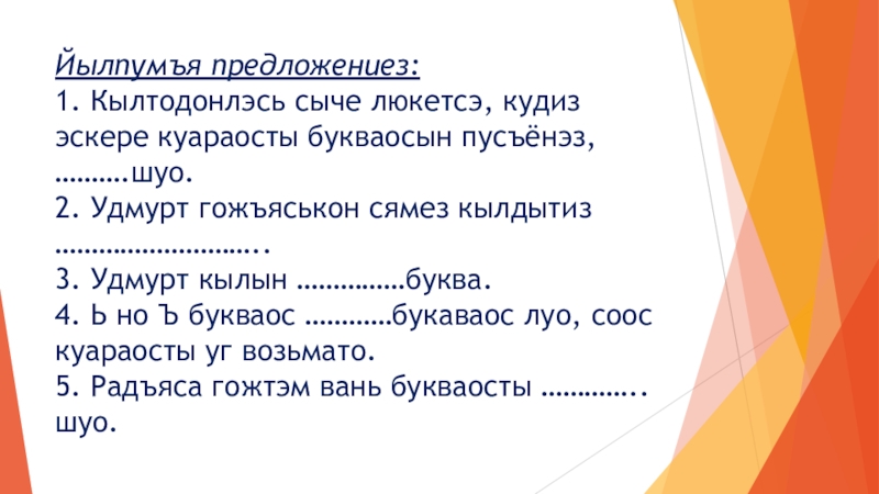 Удмурт гожъяськон сямез кылдытиз ……………………….. 3. Удмурт кылын ……………буква. 4. Ь но Ъ букваос …………букаваос луо, соос куараосты уг возьмато. 5. Радъяса гожтэм вань букваосты …………..шуо.