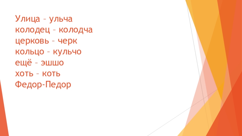 Слайд 10Улица – ульча колодец – колодча церковь – черк кольцо – кульчо ещё – эшшо хоть