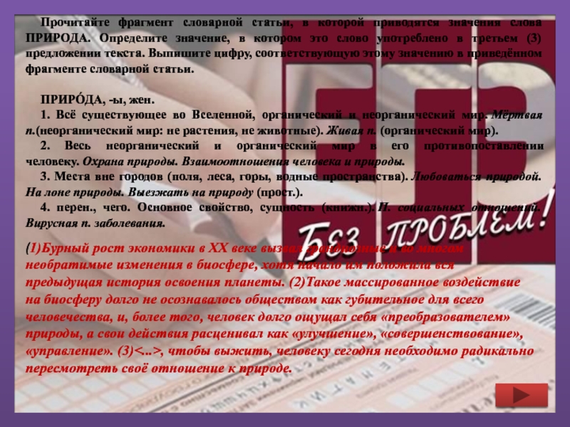 (1)Бурный рост экономики в XX веке вызвал грандиозные и во многом необратимые изменения в биосфере, хотя начало им положила вся предыдущая история освоения планеты. (2)Такое массированное воздействие на биосферу долго не осознавалось обществом как губительное для всего человечества, и, более того, человек долго ощущал себя «преобразователем» природы, а свои действия расценивал как «улучшение», «совершенствование», «управление». (3)<...>, чтобы выжить, человеку сегодня необходимо радикально пересмотреть своё отношение к природе.