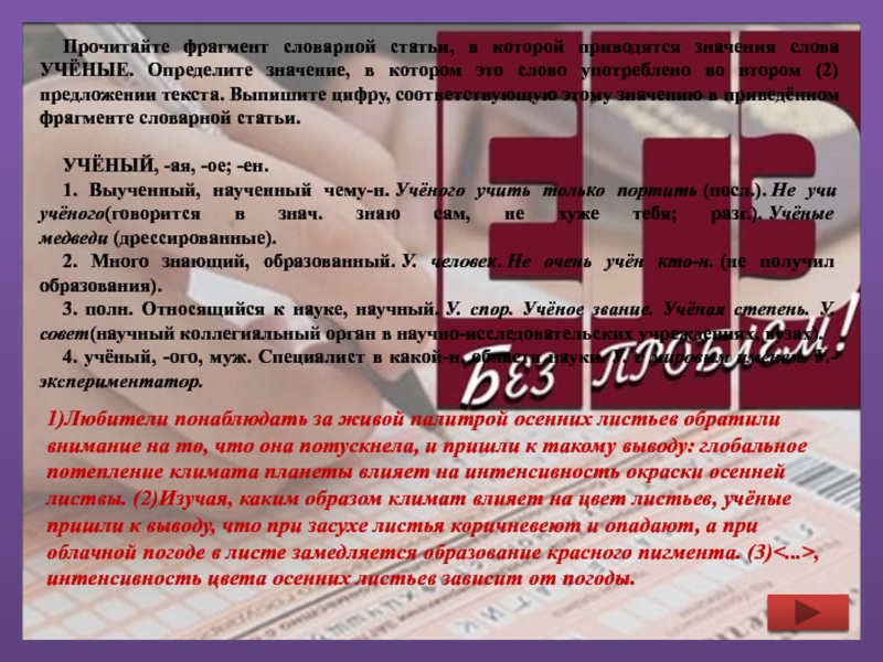 1)Любители понаблюдать за живой палитрой осенних листьев обратили внимание на то, что она потускнела, и пришли к такому выводу: глобальное потепление климата планеты влияет на интенсивность окраски осенней листвы. (2)Изучая, каким образом климат влияет на цвет листьев, учёные пришли к выводу, что при засухе листья коричневеют и опадают, а при облачной погоде в листе замедляется образование красного пигмента. (3)<...>, интенсивность цвета осенних листьев зависит от погоды.
