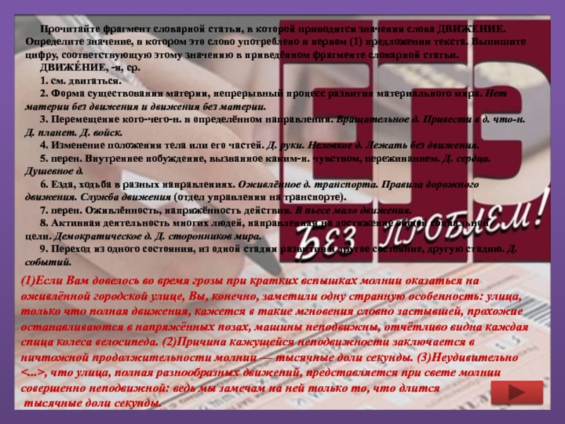 (1)Если Вам довелось во время грозы при кратких вспышках молнии оказаться на оживлённой городской улице, Вы, конечно, заметили одну странную особенность: улица, только что полная движения, кажется в такие мгновения словно застывшей, прохожие останавливаются в напряжённых позах, машины неподвижны, отчётливо видна каждая спица колеса велосипеда. (2)Причина кажущейся неподвижности заключается в ничтожной продолжительности молнии — тысячные доли секунды. (3)Неудивительно <...>, что улица, полная разнообразных движений, представляется при свете молнии совершенно неподвижной: ведь мы замечам на ней только то, что длится
