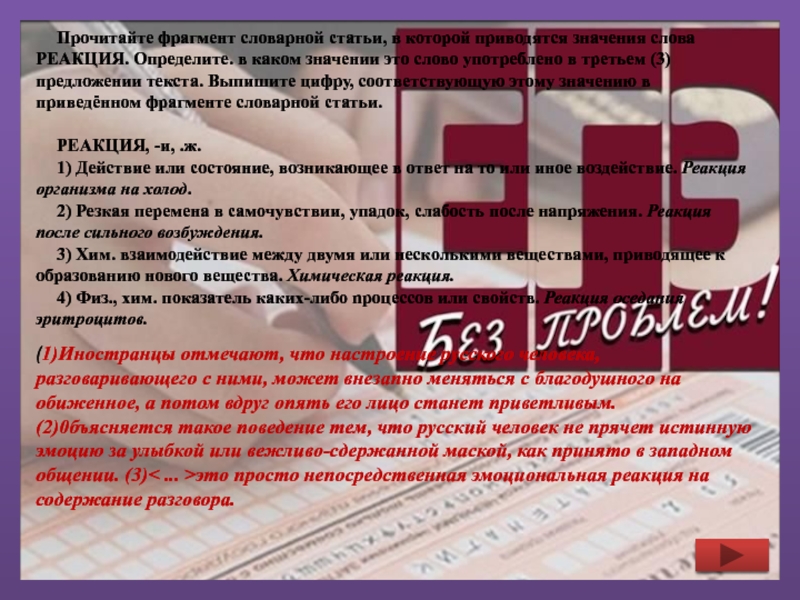 (1)Иностранцы отмечают, что настроение русского человека, разговаривающего с ними, может внезапно меняться с благодушного на обиженное, а потом вдруг опять его лицо станет приветливым. (2)0бъясняется такое поведение тем, что русский человек не прячет истинную эмоцию за улыбкой или вежливо-сдержанной маской, как принято в западном общении. (3)< ... >это просто непосредственная эмоциональная реакция на содержание разговора.