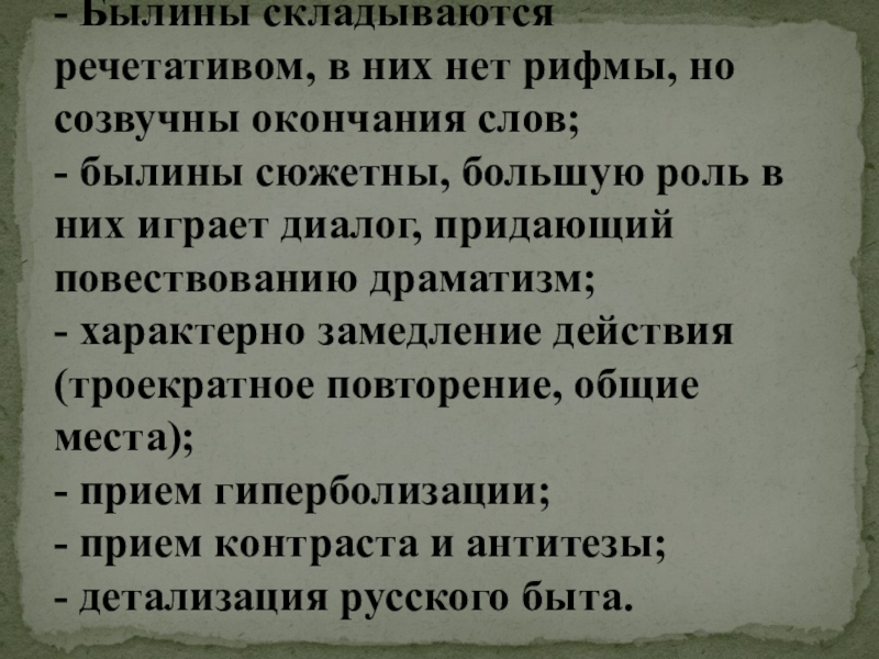 слов; - былины сюжетны, большую роль в них играет диалог, придающий повествованию драматизм; - характерно замедление действия (троекратное повторение, общие места); - прием гиперболизации; - прием контраста и антитезы; - детализация русского быта.