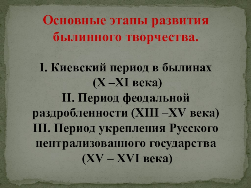 Основные этапы развития былинного творчества.  I. Киевский период в былинах  (Х –ХI века) II. Период