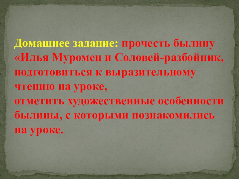 Слайд 19Домашнее задание: прочесть былину «Илья Муромец и Соловей-разбойник, подготовиться к выразительному чтению