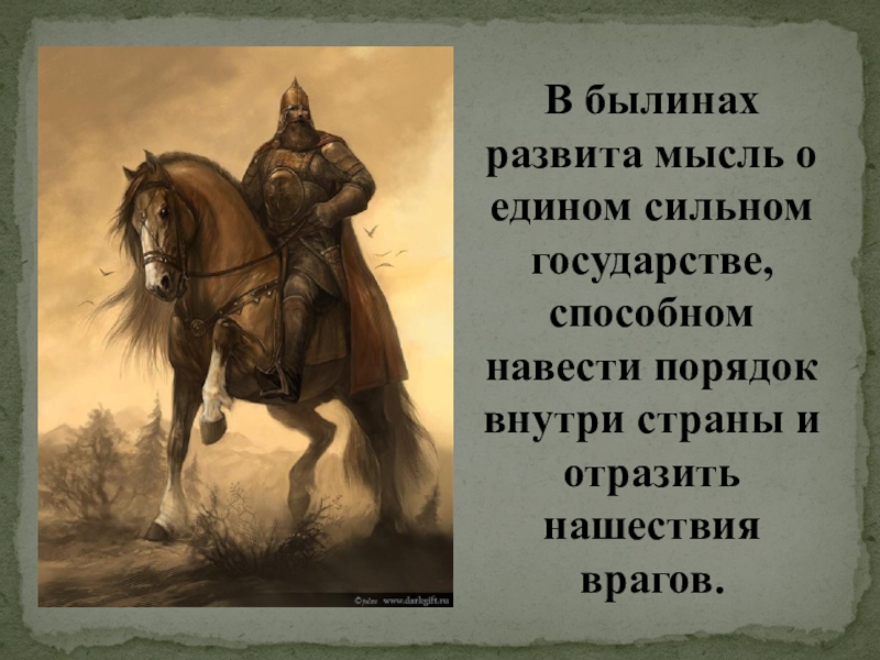 Слайд 15В былинах развита мысль о едином сильном государстве, способном навести порядок