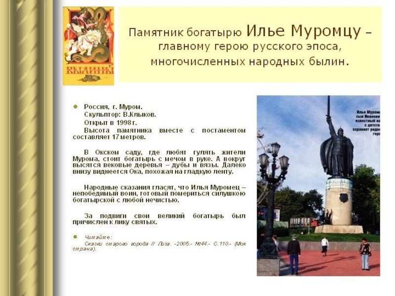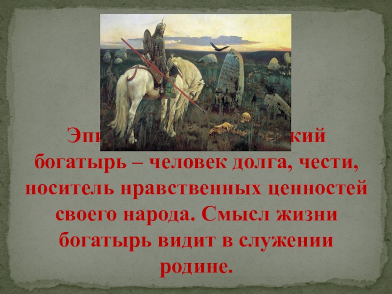Слайд 18Эпический герой, русский богатырь – человек долга, чести, носитель нравственных ценностей