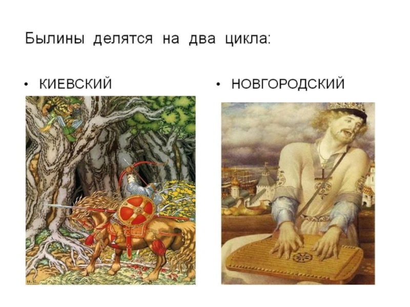 Цель урока: познакомиться с былинами как одним из крупных жанров устного народного творчества. Задачи урока: узнать об основных этапах развития былинного творчества, известных циклах этого жанра, их художественных особенностях; определить отношение народа к героям былин, выявив