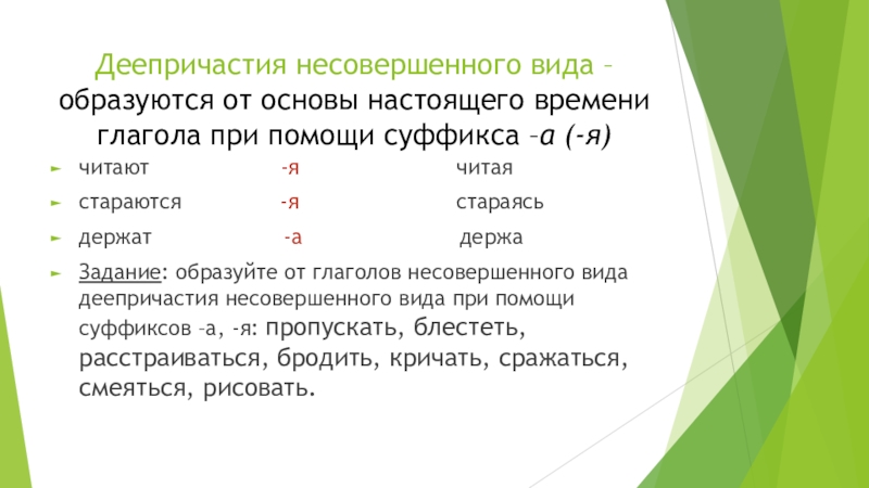 Задание: образуйте от глаголов несовершенного вида деепричастия несовершенного вида при помощи суффиксов –а, -я: пропускать, блестеть, расстраиваться, бродить, кричать, сражаться, смеяться, рисовать.