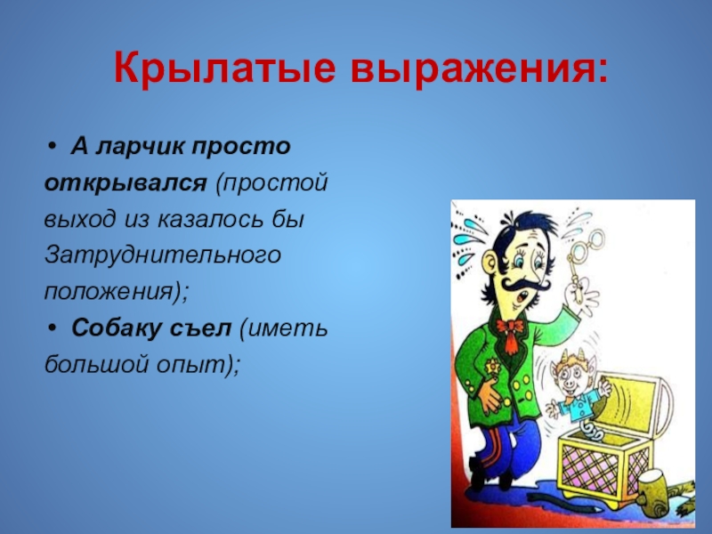 Крылатые выражения:А ларчик просто открывался (простой выход из казалось бы Затруднительногоположения);Собаку съел (иметь большой опыт);