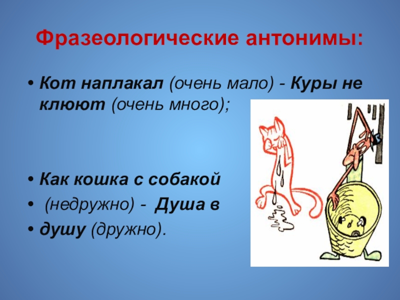 Фразеологические антонимы:Кот наплакал (очень мало) - Куры не клюют (очень много);Как кошка с собакой (недружно) - Душа в душу (дружно).
