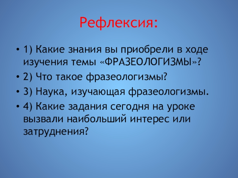 Рефлексия:1) Какие знания вы приобрели в ходе изучения темы «ФРАЗЕОЛОГИЗМЫ»?2) Что такое фразеологизмы?3) Наука, изучающая фразеологизмы.4) Какие