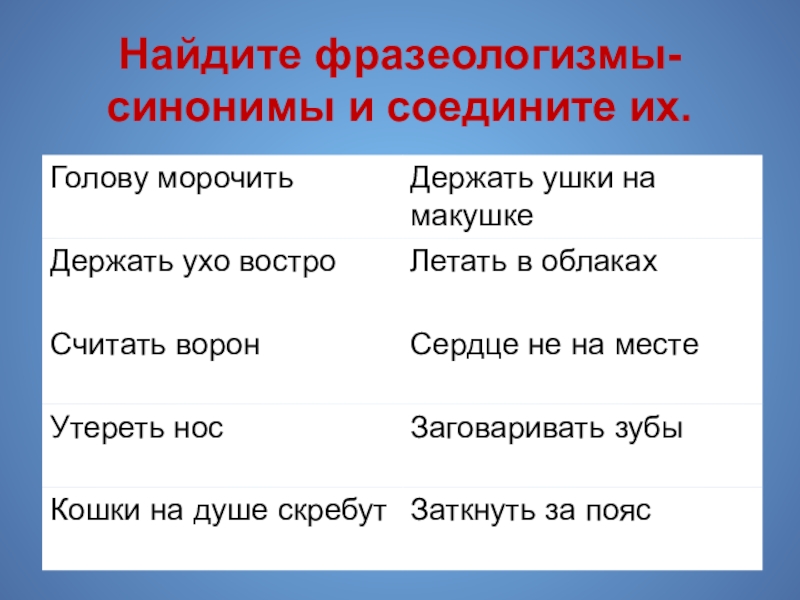 Слайд 19Найдите фразеологизмы-синонимы и соедините их.