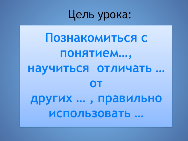 Цель урока:Познакомиться с понятием…, научиться отличать … от других … , правильно использовать …