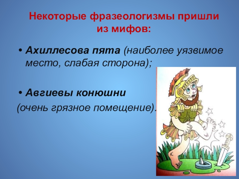 Некоторые фразеологизмы пришли  из мифов:  Ахиллесова пята (наиболее уязвимое место, слабая сторона);Авгиевы конюшни (очень грязное помещение).