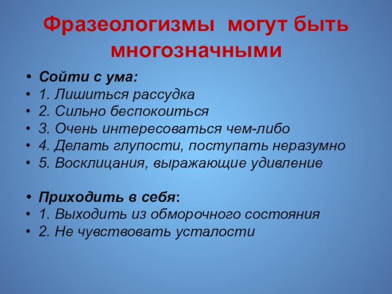 Фразеологизмы могут быть  многозначнымиСойти с ума:1. Лишиться рассудка2. Сильно беспокоиться3. Очень интересоваться чем-либо4. Делать глупости, поступать неразумно5. Восклицания, выражающие удивлениеПриходить в себя:1. Выходить