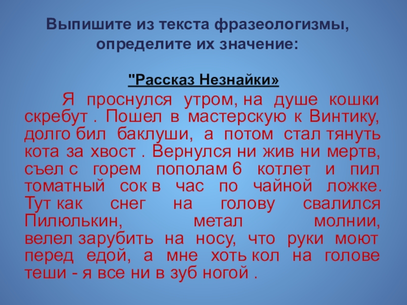 Слайд 5 Выпишите из текста фразеологизмы, определите их значение: