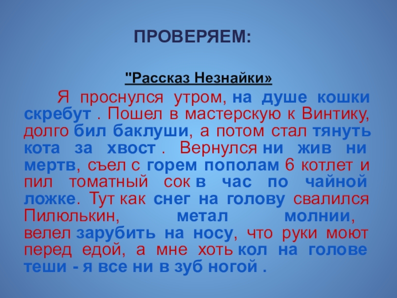 проснулся утром, на душе кошки скребут . Пошел в мастерскую к Винтику, долго бил баклуши, а потом стал тянуть кота за хвост . Вернулся ни жив ни мертв, съел с горем пополам 6 котлет и пил томатный сок в час по чайной ложке. Тут как снег на голову свалился Пилюлькин, метал молнии, велел зарубить на носу, что руки моют перед едой, а мне хоть кол на голове теши - я все ни в зуб ногой .
